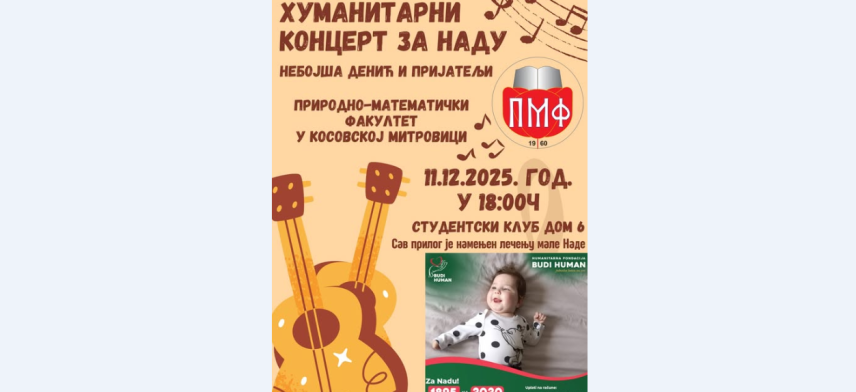 Humanitarni koncert kantautora Nebojše Denića i prijatelja, za pomoć maloj Nadi, biće održan 11. decembra u Studentskom klubu Doma broj 6, u Kosovskoj Mitrovici. Koncert će početi u 18h. Organizator je Prirodno-matematički fakultet Univerziteta u Prištini sa privremenim sedištem u Kosovskoj Mitrovici.