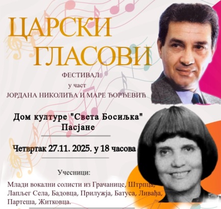 U Domu kulture “Sveta Bosiljka” u Pasjanu sutra, 27. novembra sa početkom u 18:00 časova biće održan svečani koncert posvećen legendama srpske tradicionalne muzike Jordanu Nikoliću i Mari Đorđević.