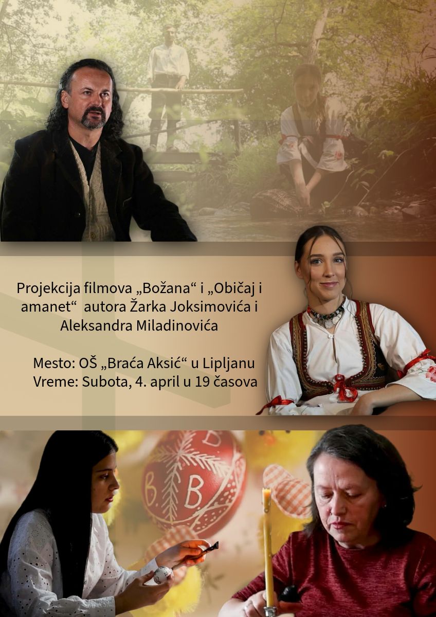Dom kulture „Lipljan“ sa sedištem u Donjoj Gušterici, OŠ „Braća Aksić“ iz Lipljana i “Produkcija Link“ organizuju projekciju filmova „Božana“ i „Običaj i amanet“ autora Žarka Joksimovića i Aleksandra Miladinovića.