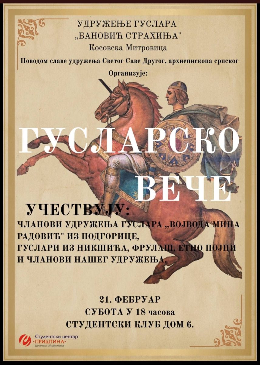 Udruženje guslara “Banović Strahinja” povodom slave udruženja Svetog Save Drugog organizuje guslarsko veče koje će biti održano u Studentskom klubu (dom 6) 21. februara u 18 časova.