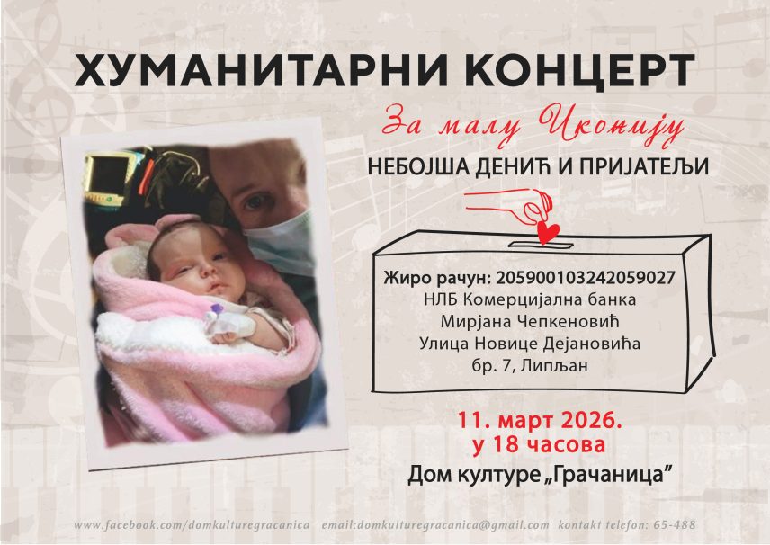 Humanitarni koncert pod nazivom „Nebojša Denić i prijatelji“ biće održan u sredu u Domu kulture u Gračanici sa početkom u 18 časova, sa ciljem prikupljanja pomoći za malu Ikoniju iz Lipljana kojoj je potrebna podrška za lečenje.