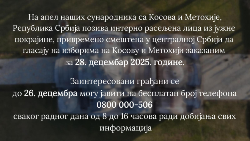 „Na apel naših sunarodnika sa AP Kosova i Metohije, Republika Srbija poziva interno raseljena lica iz južne pokrajine, privremeno smeštena u centralnoj Srbiji, da glasaju na izborima na AP Kosovu i Metohiji zakazanim za 28. decembar 2025. godine“, navedeno je u saopštenju.