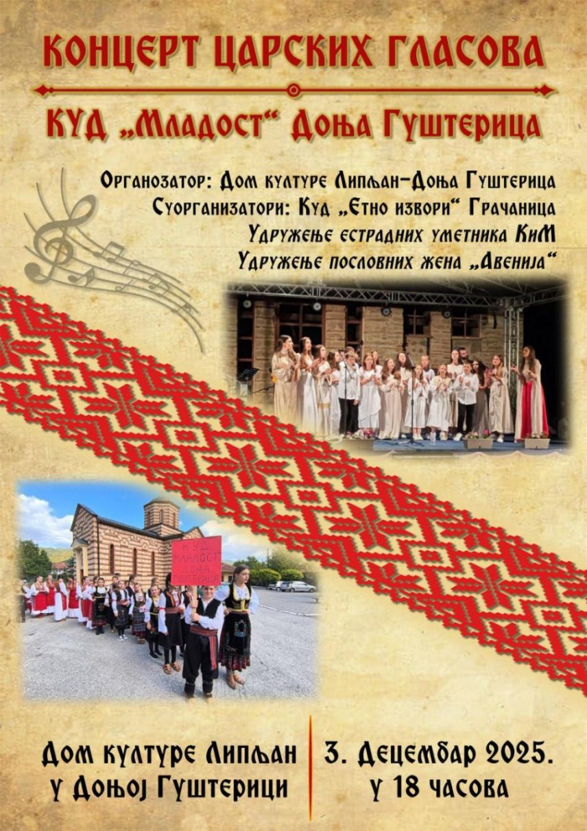 Koncert „Carski glasovi“ održaće se 3. decembra sa početkom u 18 časova u sali Doma Kulture u Donjoj Gušterici.