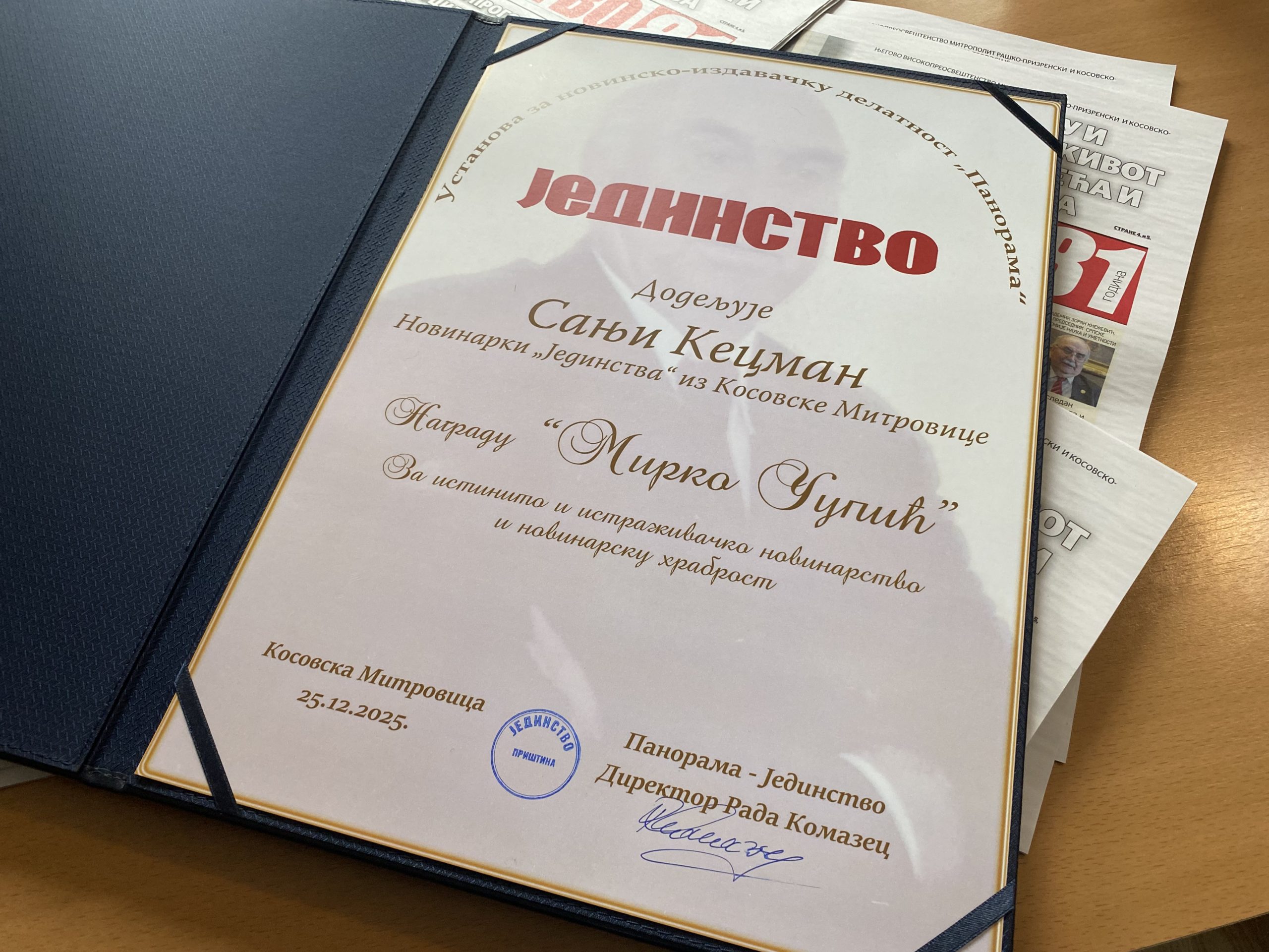 „Jedinstvo je bilo i kulturni centar pokrajine, jer nema nijednog književnika, novinara ili kulturnog radnika koji nije prošao kroz Jedinstvo. Jedinstvo nije brojalo krvna zrnca, već je sa Jedinstvom nastala renesansa kulture, ali ne samo srpske već i albanske i turske, jer ih je Jedinstvo sve afirmisalo i na neki način im bio vetar u leđa. Nakon toga su došle i sedamdesete godine, i onda Jedinstvo prvo progovara o torturi i pritiscima na srpski narod na Kosovu i Metohiji. Dok su svi ćutali, Jedinstvo je progovorilo. Pritisak je bio strašan, posebno u seoskim sredinama. Po hrabrosti, najviše se isticao naš novinar Mirko Čupić, po kojoj smo ustanovili nagradu koju svake godine dodeljujemo“ istakla je Komazec.