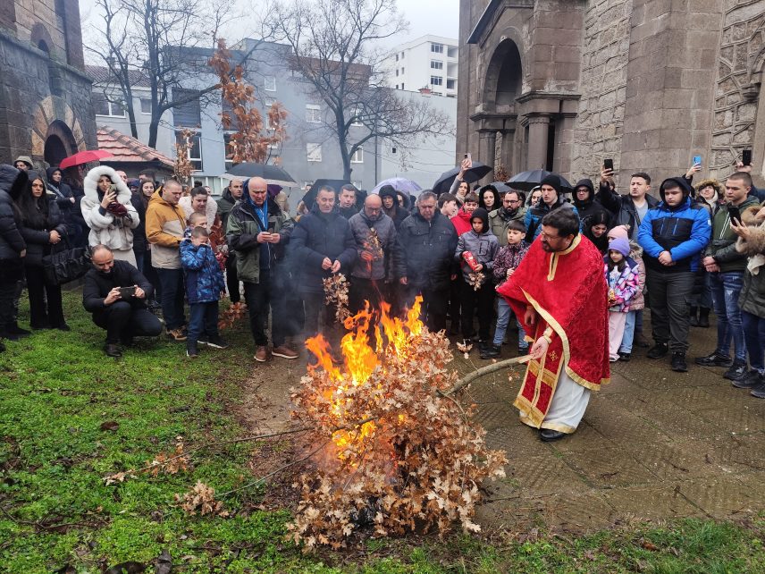 Nakon liturgije i pričešća, ispred hrama je obavljeno paljenje badnjaka.
