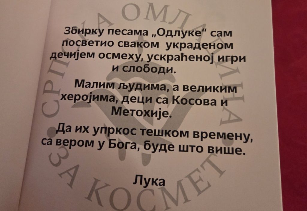 „Svakom ukradenom dečijem osmehu, uskaćenoj igri i slobodi, malim ljudima ali velikim herojima -deci sa Kosova i Metohije, da ih uprkos teškom vremenu sa verom u Boga bude što više“….piše na prvoj strani zbirke poezije“Od(Luke)“ Luke Milenkovića.