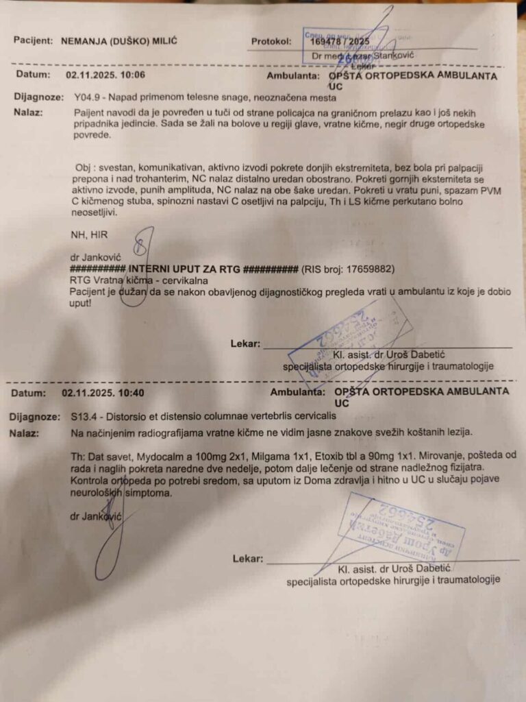 Pregled je obavio kada je stigao u Obrenovac, a iako, kako kaže, vidljivih povreda nema, pregledom mu je ustanovljen hematom na desnoj strani glave, te povrede i na desnoj strani vrata.