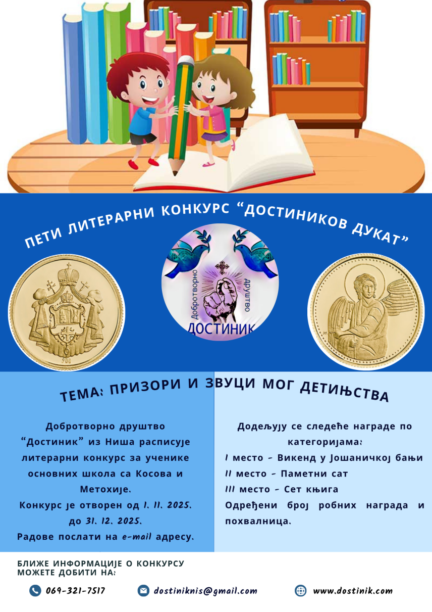 Društvo ” Dostinik” iz Niša petu godinu zaredom priređuje literarni konkurs “Dostinikov dukat” namenjen osnovnim školama sa prostora Kosova i Metohije.