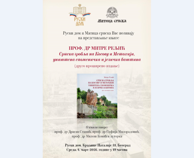 Drugo dopunjeno izdanje knjige prof. dr Mitre Reljić “Srpska groblja na Kosovui Metohiji – uništena spomenička i jezička baština”...