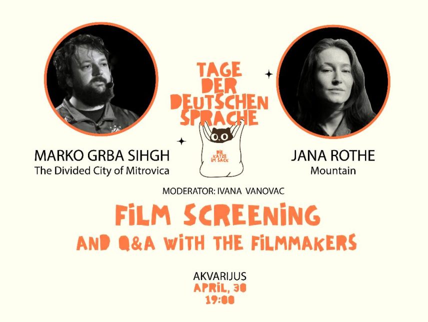 Dokumentarni filmovi „Mitrovica podeljeni grad“ Marka Grbe Singha i „Planina“ (Mountain) luksemburške rediteljke Žane Rot (Jana Rothe) biće prikazani u mitrovičkom Privatnom kulturnom centru „Akvarijus“ 30. aprila 2026. godine. Početak prve projekcije zakazan je za 19.00, a nakon emitovanja filmova predviđen je i razgovor sa Žanom Rot koja trenutno boravi na IV Mitrovičkoj umetničkoj rezidenciji, kao i sa protagonistima filma „Mitrovica podeljeni grad“. Razgovor će voditi IvanaVanovac.