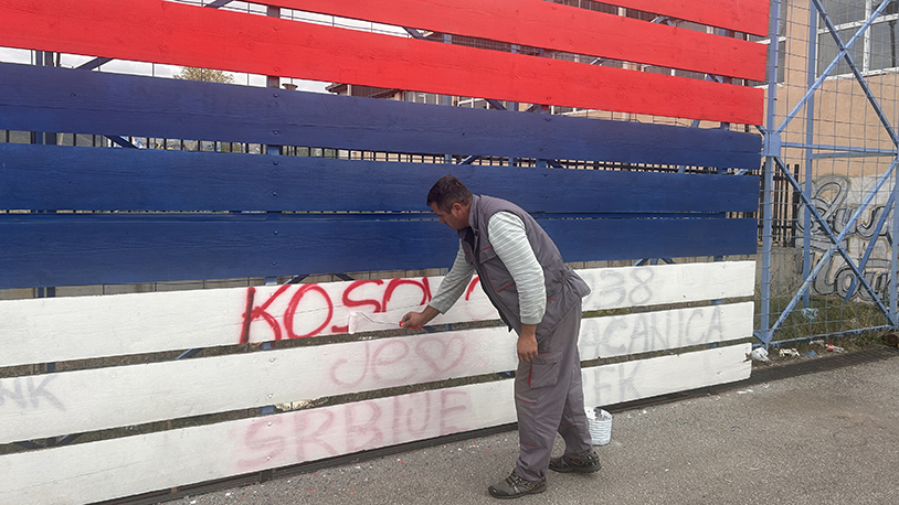 Na drvenoj ogradi obojenoj u bojama srpske trobojke ispisano je više poruka, a u središtu ograde crvenim sprejom ispisano je „Kosovo je srce Srbije“.