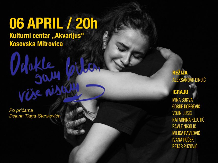 Predstava „Odakle sam bila, više nisam“ studenata treće godine glume na Fakultetu umetnosti biće odigrana u mitrovičkom Privatnom kulturnom centru „Akvarijus“ 6. aprila 2026. godine.