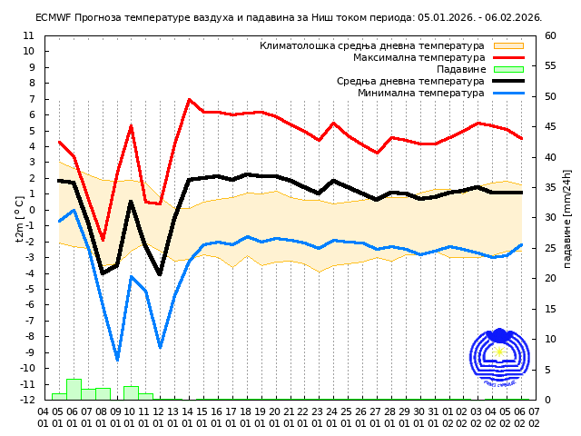 Najniža temperatura kretaće se od -4 do 1, na jugu i jugoistoku Srbije do 7, najviša od -2 do 2, na krajnjem jugu i jugoistoku do 9 stepeni.
