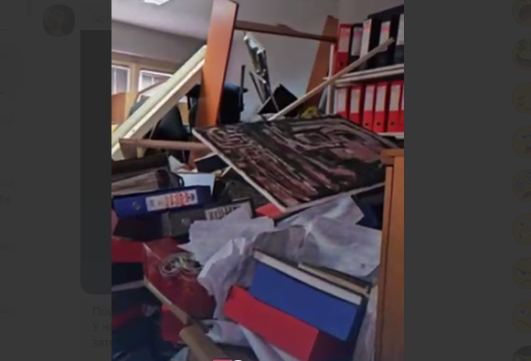 Na snimku se jasno vidi da je deo nameštaja isprevrtan i oštećen. Čini se da je i opštinska arhiva u vrlo nezavidnom stanju. Oštećeni su i pojedini zidovi, kao i oprema i instalacije.