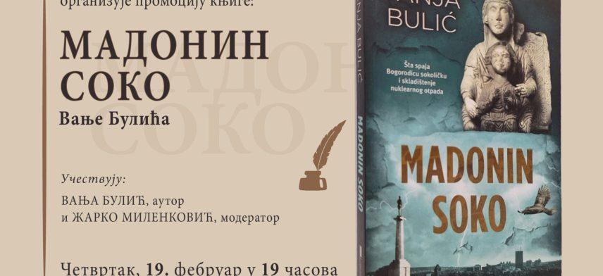 Promocija knjige „Madonin soko“, autora Vanje Bulića održaće se u Domu kulture “Gračanica” u četvrtak 19. februara u 19 časova. Razgovor sa gostom vodiće književnik Žarko Milenković. „Novak Ivanović, novinar sa posebnim interesovanjem za stare hrišćanske artefakte, našao se u novoj misteriji, koja ovog puta počinje šokantnim otkrićem – lešom mlade plavokose žene, ubijene harpunom […]
