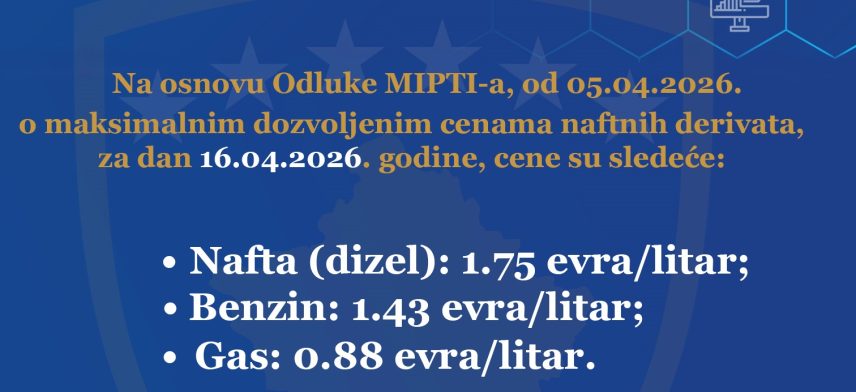 Maksimalna cena dizela, benzina i gasa na Kosovu danas je za jedan cent niža nego juče, objavilo je Ministarstvo industrije, preduzetništva, trgovine i inovacija Kosova. Prema odluci Ministarstva, današnja maksimalna cena dizela je 1,75 evra, a benzina 1,43 evra po litru. Nova maksimalna cena gasa za automobile je 0,88 evra po litru, dok je juče […]