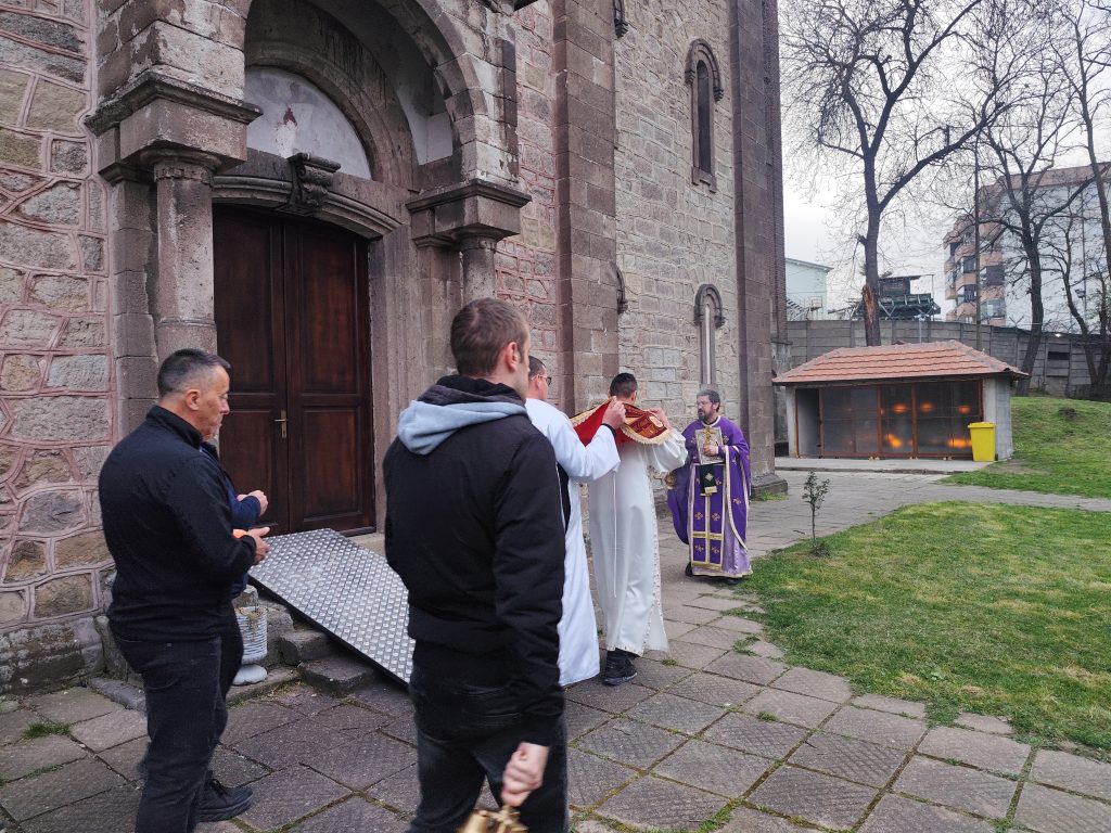 U hramu Svetog Dimitrija u Severnoj Mitrovici Večernje je služeno u prisustvu velikog broja vernika. Bogosluženjem je načalstvovao episkop raško-prizrenski i kosovsko-metohijski Teodosije, uz sasluženje sveštenstva hrama.