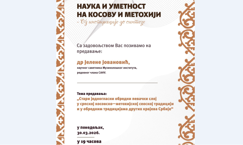 U ponedeljak,30. marta, u 19 časova, u Galeriji fakulteta umetnosti, biće održano predavanje ,,Stari jednoglasni obredni pevački sloj u srpskoj kosovsko-metohijskoj seoskoj tradiciji i u obrednim tradicijama drugih krajeva Srbije”.