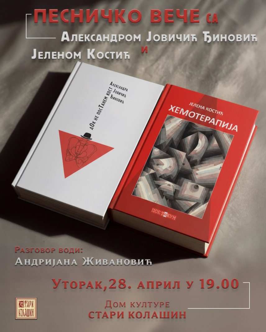 Dom kulture “Stari Kolašin” organizuje veče poezije sa Aleksandrom Jovičić Đinović i Jelenom Kostić, u utorak 28.aprila u 19 časova.